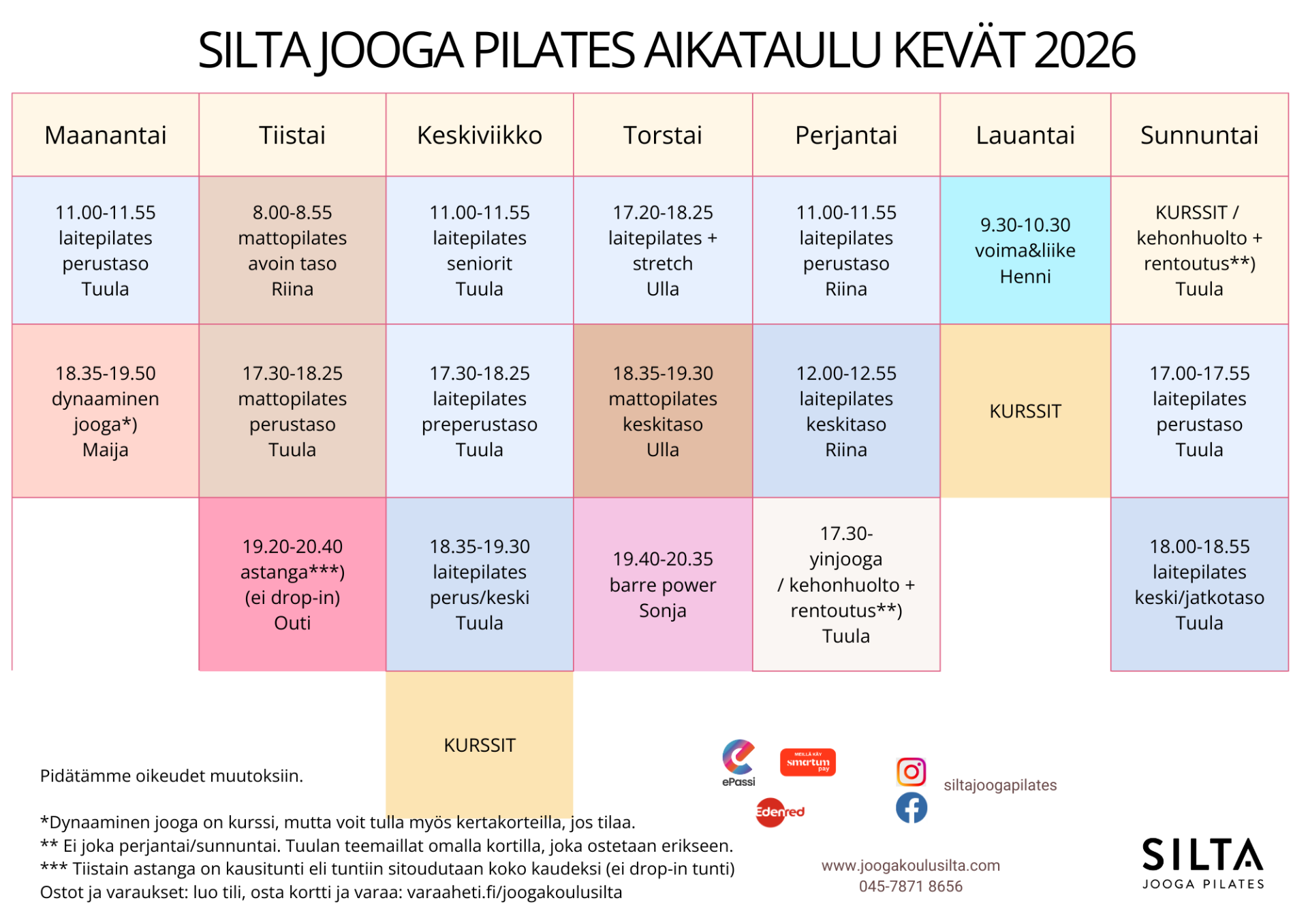 Kevätkausi loppuu pääsääntöisesti 14.6.2026. Huom. kesäkuussa ei ole enää tunteja viikonloppuisin. Jotkin viikolla olevat pilatestunnit jatkuvat 28.6. asti.